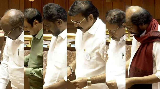 அதே போன்று அதிமுக கூட்டணியில் அதிமுக சார்பில் ஒருவரும், அதன் கூட்டணிக் கட்சியான பாமக சார்பில் ஒருவரும் என மொத்தம் 2 பேர் தேர்ந்தெடுக்கப்பட்டனர். இந்நிலையில் திருச்சி சிவா, ஜெ. கான்ஸ்டன்டைன் ரவீந்திரன், அன்புமணி ராமதாஸ், எம். கிறிஸ்டோபர் திலக், எல்.கே. சுதீஷ் மற்றும் எம். தம்பிதுரை ஆகியோர் நாடாளுமன்ற மாநிலங்களவை உறுப்பினர்களாக இன்று (06.04.2026) பதவி ஏற்றுக்கொண்டனர். இன்று காலை 11 மணிக்கு அவை கூடியதும் மாநிலங்களவை தலைவரும், துணைக் குடியரசுத் தலைவருமான சி.பி. ராதாகிருஷ்ணன் பதவிப் பிரமாணம் செய்து வைத்தார். இவர்கள் 6 பேரும் தமிழில் பதவியேற்றுக் கொண்டனர்.