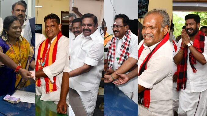 வேட்புமனுத் தாக்கலுக்கான கடைசி நாளான இன்று அதிமுக பொதுச்செயலாளர் எடப்பாடி பழனிசாமி, பாஜக தலைவர் நயினார் நாகேந்திரன், மத்திய இணையமைச்சர் எல்.முருகன், பாஜகவின் வானதி சீனிவாசன் ஆகியோர் தங்கள் வேட்புமனுவை தாக்கல் செய்தனர். தனது மகனுக்கு மாற்றாக திமுக அமைச்சர் காந்தியும் இன்று வேட்புமனுத் தாக்கல் செய்தார்.