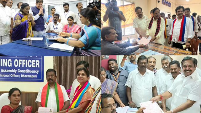 இன்றைய தினம் அ.தி.மு.க. பொதுச்செயலாளர் எடப்பாடி பழனிசாமி, அமைச்சர் துரைமுருகன், முன்னாள் முதல்-அமைச்சர் ஓ. பன்னீர் செல்வம் இன்று மனு தாக்கல் செய்தனர். மத்திய மந்திரி எல்.முருகன், அமைச்சர் காந்தி, தமிழிசை சவுந்தரராஜன், விஜய பிரபாகரன் உள்ளிட்டோரும், விருத்தாசலத்தில் பிரேமலதா, தர்மபுரியில் சவுமியா அன்புமணி ஆகியோரும் இன்று மனு தாக்கல் செய்துள்ளனர்.