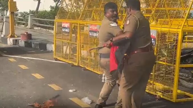 இந்நிலையில், தனது மகளுக்கு நீதி கோரி, காவலர் சீருடையில் தலைமைச் செயலகத்திற்கு வந்த கோதண்டபாணி, திமுக கொடியை எரித்து போராட்டத்தில் ஈடுபட்டார். மேலும் 2021 -ஆம் ஆண்டு திமுக ஆட்சி காலத்தில் தான் தனது மகளுக்கு தவறான சிகிச்சை அளிக்கப்பட்டதாக கூறிய அவர் தனது மகளுடன் வந்து தலைமை செயலக வாயிலில் திமுக கொடியை எரித்து போராட்டத்தில் ஈடுபட்டார்