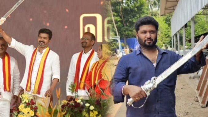 இதுகுறித்து அந்த வாளை வடிவமைத் சிற்பக் கலைஞர்களான ராதாகிருஷ்ணன் மற்றும் அவரது மகன் சதாசிவம் ஆகியோர் பிரத்தியேக பேட்டி அளித்துள்ளனர். இது குறித்து ராதாகிருஷ்ணன் கூறும்போது, நாங்கள் தஞ்சை பெரிய கோவிலை கட்டுவதற்காக வந்த குடும்பம். தலைமுறை தலைமுறையாக இந்த சிற்பக்கலை தொழிலில் ஈடுபட்டு வருகிறோம். என்னுடைய தந்தை 1972ம் ஆண்டு கலைஞருக்கு மனு நீதி சோழன் சிலையை செய்து கொடுத்தார். அதேபோல் எம்ஜிஆர் மற்றும் ஜெயலலிதா வீட்டில் பூஜை சுவாமி விக்ரகங்கள் அனைத்தும் என்னுடைய தந்தைதான் செய்து கொடுத்தார். நான் ஜெயலலிதாவுக்கு கத்தி மற்றும் கேடயம் செய்து கொடுத்தேன். அதேபோல் தற்போதைய முதலமைச்சருக்கு செங்கோல் செய்து கொடுத்தோன். கட்சி பாகுபாடு இன்றி சிற்பத் தொழிலுக்காக மரியாதை கொடுத்தார்கள்.அதற்காக நாங்கள் செய்து கொடுத்து வருகிறோம். தற்போது என்னுடைய மகன் நடிகர் விஜய்க்கு வீரவாள் செய்து கொடுத்திருப்பதாக தெரிவித்தார்.