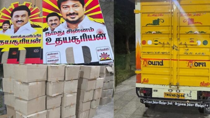 இந்த நிலையில், மதுரவாயல் தொகுதிக்குட்பட்ட வானகரம் செட்டியார் அகரம் சந்திப்பு அருகே டாட்டா ஏஸ் வாகனத்தை தேர்தல் பறக்கும் படையினர் மடக்கி சோதனையிட்ட போது அதில் திமுக கட்சியின் பதாகைகள் மற்றும் துண்டு பிரசுரங்கள் இருந்துள்ளது.