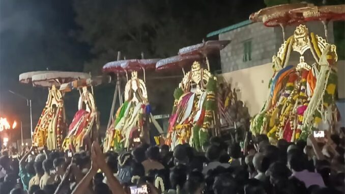 ரதவீதிகள் வழியாக, திருவீதி உலா வந்த 5 நம்பிகளும் இன்று அதிகாலை 2.50 மணிக்கு மேல ரதவீதியில் மேற்கு நோக்கி எழுந்தருளி, மகேந்திரகிரி மலையை கடாஷித்து அங்கு வாழும் தேவகந்தர்வ சித்தர்களுக்கு திருக்காட்சி அளித்தனர். அப்போது நம்பி சுவாமிகளுக்கு சிறப்பு தீபாராதனை நடைபெற்றது.