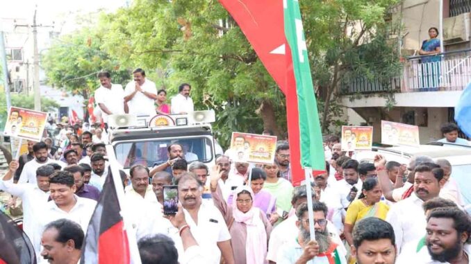 இதற்கிடையே சட்டப்பேரவை தேர்தலுக்காக அனைத்து கட்சிகளும் வேட்பாளர்களை அறிவித்து தீவிரமாகப் பரப்புரையில் இறங்கியுள்ளன. மேலும் வேட்பாளர்கள் தேர்தல் பிரச்சாரத்திலும் தீவிரம் காட்டி வருகின்றனர். இந்நிலையில் திருச்சியில் திமுக முதன்மைச் செயலாளரும், அமைச்சரும், மேற்கு தொகுதி சட்டமன்ற உறுப்பினருமான கே.என். நேரு 51வது வார்டுக்கு உட்பட்ட கூனி பஜார், செவென்த் டே பள்ளி அருகில் திமுக அரசின் சாதனைகளை எடுத்துக் கூறி உதயசூரியன் சின்னத்திற்கு வாக்குகள் சேகரித்தார்.