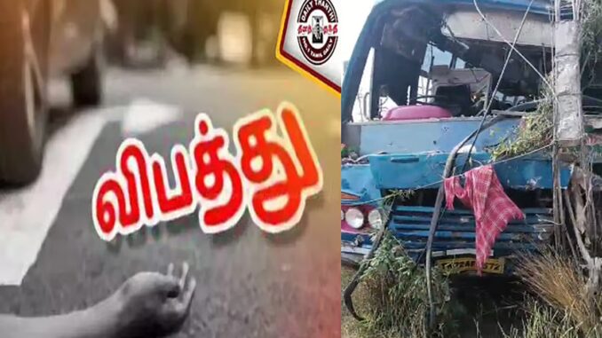 சுமார் 60-க்கும் மேற்பட்ட பயணிகளுடன் சென்று கொண்டிருந்த அந்தப் பேருந்து, இன்று காலையில் தூத்துக்குடி-திருநெல்வேலி பிரதான சாலையில் உள்ள மறவன்மடம் அருகே வந்தபோது எதிர்பாராதவிதமாக டிரைவரின் கட்டுப்பாட்டை இழந்தது. கட்டுப்பாடின்றி சென்ற பேருந்து, சாலையோரம் இருந்த மின்கம்பத்தில் மோதியதோடு, அங்கிருந்த ஒரு பனைமரத்தின் மீதும் மோதியது.
