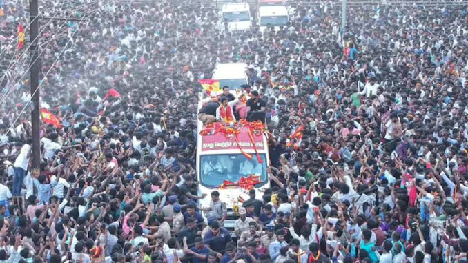 சமீபத்தில் சட்டமன்றத் தேர்தலில் போட்டியிடும் தவெக கட்சியின் வேட்பாளர்களுக்கு ஆதரவு வேண்டி தூத்துக்குடியில் அதன் தலைவர் விஜய் பரப்புரை மேற்கொண்டார். அங்கு எப்போதும் இல்லாத அளவுக்கு விஜயை பார்க்க ரசிகர்கள் மற்றும் கட்சி தொண்டர்கள் அதிகமாக திரண்டதால் அப்பகுதியில் மிகப்பெரிய கூட்டம் கூடியது.