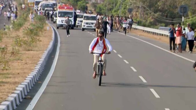 அப்போது விஜய், திடீரென பரப்புரை வாகனத்தில் இருந்து இறங்கி, தேசிய நெடுஞ்சாலையில் சைக்கிள் ஓட்டினார். விஜய்யை கண்டதும் நெடுஞ்சாலையில் தொண்டர்கள் ஏராளமானோர் குவிந்தனர். விஜய் சைக்கிள் ஓட்டியபடி தொண்டர்களுக்கு கையசைத்து சென்று கொண்டிருந்தார். இதில் சில தொண்டர்கள் அவரை பின் தொடர்ந்து ஓடி வந்தனர். ஏராளமான தொண்டர்கள் அங்கு குவிந்ததால் சைக்கிள் ஓட்டுவதை விட்டுவிட்டு உடனடியாக மீண்டும் பரப்புரை வாகனத்தில் ஏறி விஜய் பயணித்தார்.