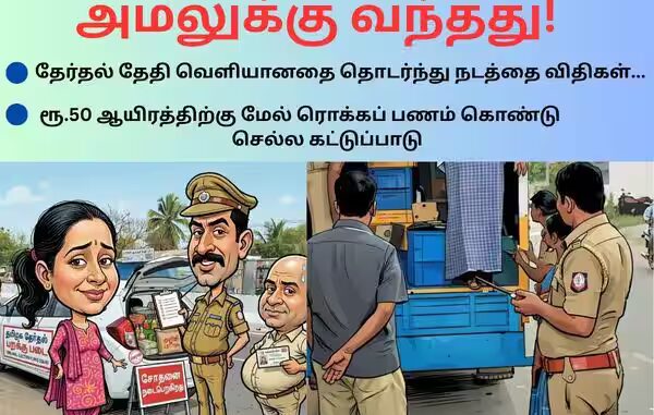 * தேர்தல் நடத்தை விதிகள் அமலுக்கு வந்ததால், ஆவணங்கள் இன்றி அதிகபட்சமாக ரூ.50 ஆயிரம் வரை மட்டுமே ரொக்கமாக எடுத்து செல்ல வேண்டும். அதற்கு மேல், அதாவது 50 ஆயிரம் ரூபாய்க்கும் அதிகமான பணத்தை கொண்டு சென்றால், உரிய ஆவணங்கள் சமர்ப்பிக்கப்பட வேண்டும்; இல்லையெனில், தேர்தல் பறக்கும் படையினரால் பணம் பறிமுதல் செய்யப்படும்.