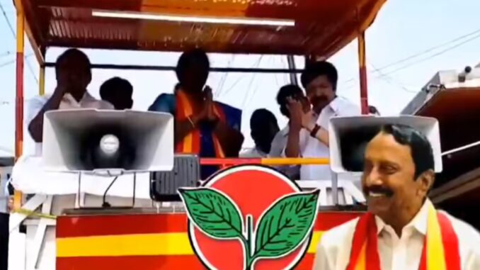 தவெக பிரச்சார கூட்டத்தில் தவெக முக்கிய நிர்வாகி செங்கோட்டையன் இரட்டை இலை சின்னத்திற்கு வாக்கு கேட்டதால் சலசலப்பு ஏற்பட்டு உள்ளது.
