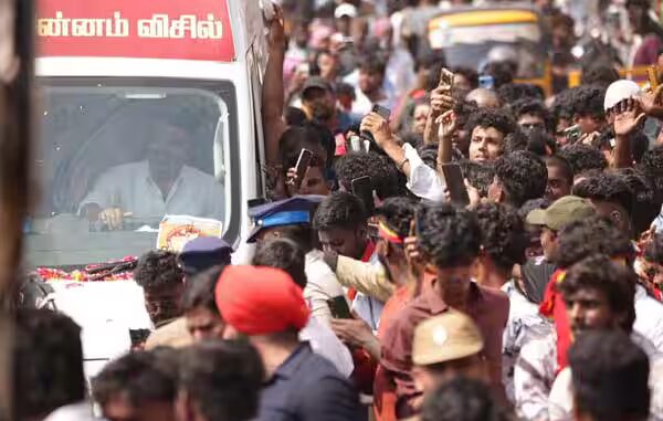 விஜய் மற்றும் அவரை காண வந்த 3,000 பேர், பொது மக்களுக்கும் போக்குவரத்துக்கும் தடையாக நின்றனர். பொது மக்கள், தொண்டர்கள் என, 5,000 பேர் கூடி, 30 ஒலிபெருக்கிகள் பயன்படுத்தி, ‘ரோடு ஷோ’ நடத்தி, போக்கு வரத்துக்கு தடை ஏற்படுத்தினர்.
