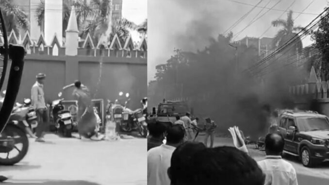 அதாவது, ஒரு பெண் பெட்ரோல் நிரப்பி வைத்திருந்த பாட்டிலில் தீயைப் பற்றவைத்து நீதிமன்ற வளாகத்தினுள் வீசியுள்ளார். இந்த தீ பற்றிய பாட்டில் நீதிமன்ற சுற்றுச்சுவர் மீது பட்டு கீழே விழுந்தது. அதில் ஏற்பட்ட தீயினால், அருகில் அருகில் இருந்த வாகனங்கள் தீப்பற்றி எரிந்தது. இதில், ஒரு நான்கு சக்கர வாகனம் மற்றும் மூன்று இரு சக்கர வாகனங்கள் தீயில் கருகி சாம்பலாகின. இது சம்பந்தமாக வெளியான வீடியோவில், சம்பந்தப்பட்ட பெண் அடையாளம் காணப்பட்டு காவல்துறையினரால் கைது செய்யப்பட்டார்.