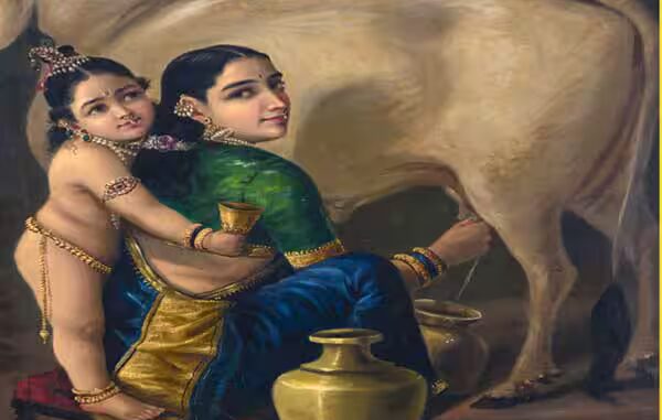 யசோதை பசுவிடம் பால் கறப்பது போலவும், குழந்தை கிருஷ்ணர் பால் கேட்பது போலவும் தத்ரூபமாக இந்த ஓவியத்தில் சித்தரிக்கப்பட்டுள்ளது.