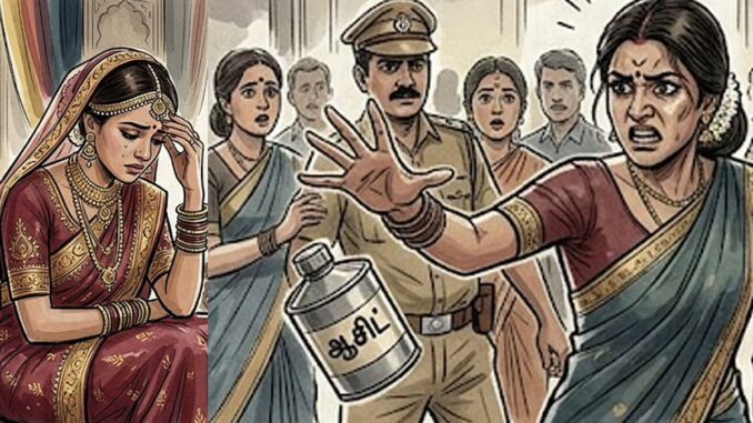 பக்கத்து வீட்டு பெண்கள் சிலர் அவருக்கு மெகந்தி உள்ளிட்ட அலங்காரங்கள் செய்து கொண்டிருந்தனர். அப்போது பக்கத்துவீட்டை சேர்ந்த குலிஸ்தா (26) என்ற இளம்பெண்ணும் அங்கு வந்திருந்தார். திடீரென்று மணமகள் ஷப்னம் முகத்தில் குலிஸ்தா ஆசிட் வீசினார். பின்னர் அங்கிருந்து ஓடிவிட்டார். ஆசிட் வீச்சில் பலத்த காயம் அடைந்த ஷப்னம் அங்குள்ள ஆஸ்பத்திரியில் அனுமதிக்கப்பட்டார்.