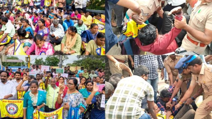 சென்னை எழும்பூரில் காந்தி இரவின் பாலத்தில் நடைபாதை ஓரமாக அமர்ந்து ஆசிரியர்கள் போராட்டத்தில் ஈடுபட்டனர். போராட்டத்தை கைவிட சொல்லி இடைநிலை ஆசிரியர்களிடம் போலீசார் நடத்தி பேச்சுவார்த்தை சமரசம் ஏற்படத்தால், அவர்களை வலுக்கட்டாயமாக போலீசார் கைது தனியார் திருமண மண்டபங்களில் தங்க வைத்தனர்.