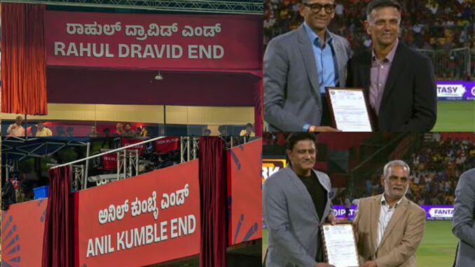 இந்திய கிரிக்கெட் அணியின் முன்னாள் கேப்டன்களான கர்நாடகாவைச் சேர்ந்த ராகுல் டிராவிட், அனில் கும்பிளே ஆகியோரது பெயர்கள் பெங்களூரு சின்னசாமி ஸ்டேடியத்தில் உள்ள கேலரியின் ஒரு பகுதிக்கு சூட்டப்பட்டுள்ளது. அந்த பெயர் பலகை நேற்று திறக்கப்பட்டது.