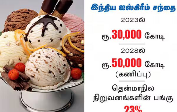 வேகமாக வளர்ந்து வரும் தொழிலாக ஐஸ் கிரீம் தயாரிப்பு இருந்து வருகிறது. கடந்த 2023ல் 30,000 கோடி ரூபாயாக இருந்த இந்திய ஐஸ்கிரீம் சந்தை 2028ல் 50,000 கோடி ரூபாயாக உயரும் என கணிக்கப்பட்டுள்ளது. இதில், 23 சதவீதம் தென்மாநில ஐஸ்கிரீம் நிறுவனங்கள் பங்களிக்கின்றன.