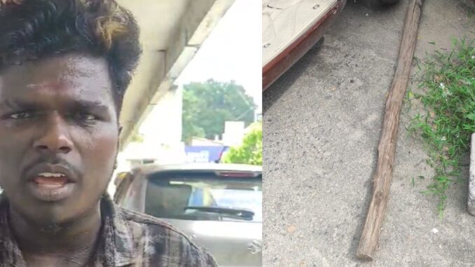 சென்னை அயனாவரம் செல்வதற்காக காத்திருந்த மைதிலி என்பவர் போனில் பேசிக் கொண்டிருந்தார். அப்போது இளைஞர் ஒருவர் உருட்டுக்கட்டையோடு வந்து செல்போனை தந்து விட்டு ஓடி விடு என மிரட்டியதால் பரபரப்பு ஏற்பட்டது. பயந்துபோன அந்த பெண் அருகில் இருந்த கூச்சலிட்டதால் அருகில் இருந்த போக்குவரத்து காவலர் வந்து விட்டார். அந்த இளைஞரிடம் உருட்டுக் கட்டையை கைப்பற்றி விட்டு சாலையோரமாக உட்கார வைத்தனர்.