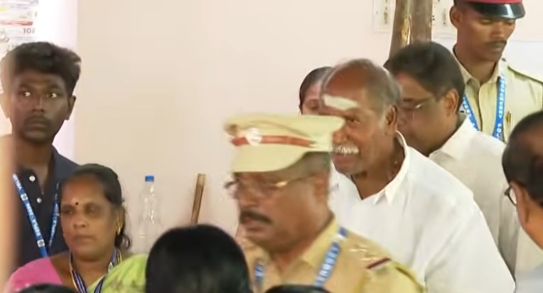 வாக்களித்த முதல்வர் ரங்கசாமிபுதுச்சேரி முதல்வர் ரங்கசாமி, இந்திராநகர் லாஸ்பேட்டை பிள்ளையார் கோயில் வீதியில் வசிக்கிறார். லாஸ்பேட்டையில் உள்ள அரசு நடுநிலைப்பள்ளி வாக்குச்சாவடியில் தனது வாக்கை பதிவு செய்ய வீட்டிலிருந்து தனது இருசக்கர வாகனத்தில் ரங்கசாமி வந்தார்.