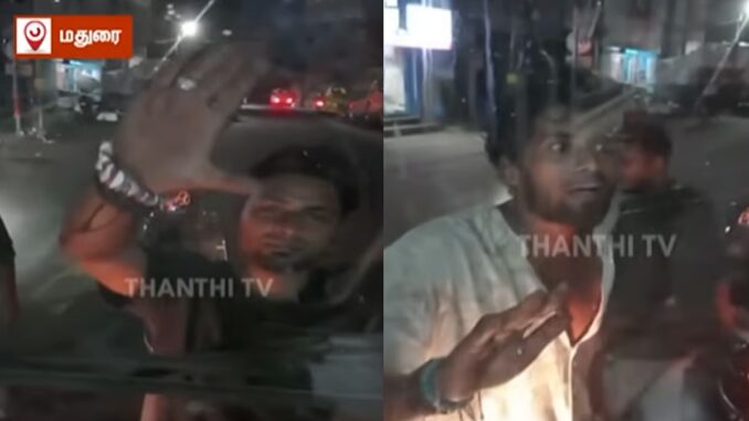 மதுரை திருமலை நாயக்கர் மஹால் பகுதியில், சாலையில் சென்று கொண்டிருந்த அரசு பேருந்தை இருசக்கர வாகனத்தில் வந்த 3 இளைஞர்கள் வழிமறித்து நிறுத்தினர். பின்னர் அவர்கள் பேருந்தின் ஓட்டுநர் மற்றும் நடத்துனருடன் தகராறில் ஈடுபட்டனர். அவர்கள் மூவரும் மது போதையில் இருந்ததாக கூறப்படுகிறது.