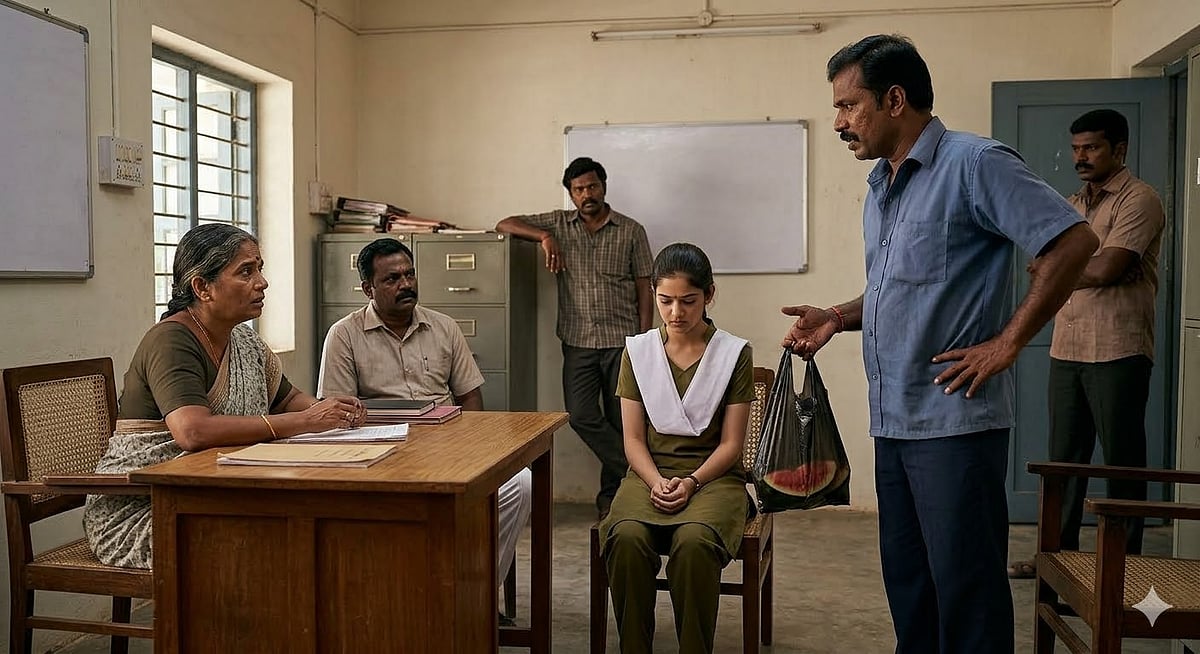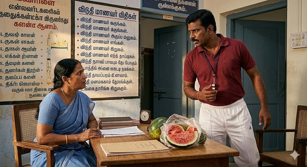 ‘நேற்று மதியம் முதல் பாடவேளையில் ஒரு கருப்பு கலர் கேரி பையுடன் இந்தப் பெண் வேனில் ஏறியதைப் பார்த்தேன். சிறிது நேரத்தில் கீழே இறங்கியதையும் எதேச்சையாகப் பார்த்தேன். சிறிது நேரம் சென்றதும் என்னுடைய வேனுக்குள் சென்று சோதித்தேன். தர்பூசணிப் பழம் பையில்இருந்தது. வேன் சூப்பர்வைசரிடம் கொடுத்தேன்’. இது ஓட்டுநர் தந்த விளக்கம்.