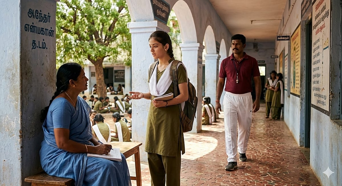 வராண்டாவில் எட்டிப் பார்த்தேன். சாமிநாதன் நின்றுகொண்டுஇருந்தார். விளையாட்டுத் துறை ஆசிரியர். ஆசிரியர்கள் இல்லாத நேரத்தில் வகுப்பறைகளைக் கண்காணிப்பவர். மாணவிகள் வகுப்பறையை விட்டு வெளியே வருவதற்கும் வேறெங்கும் செல்வதற்கும் அவரது அனுமதி தேவை.