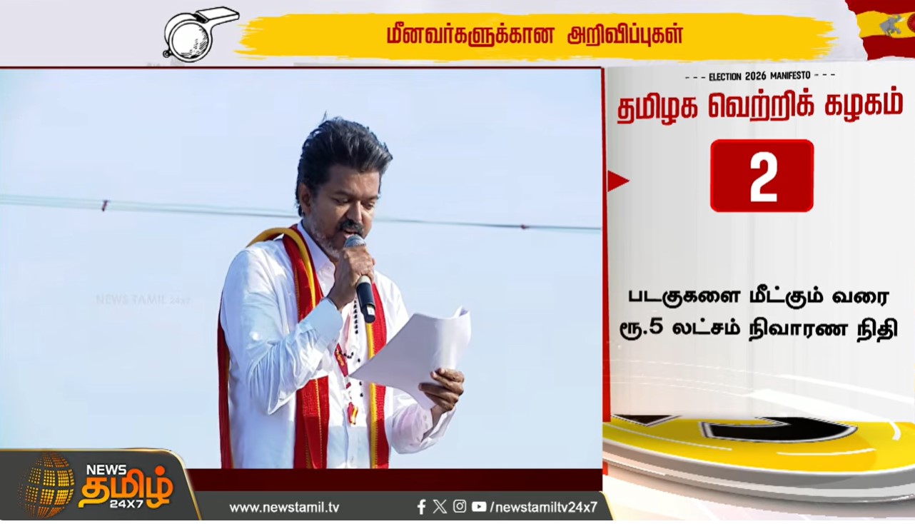 * கடல் தாய் வீட்டு வசதி திட்டம்கடலோர பகுதிகளில் உள்ள அனைத்து குடிசைகளையும், சிதிலமடைந்த குடியிருப்புகளையும் அகற்றி, புயல்களை தாங்கக்கூடிய காலநிலை மாற்றத்தை வீடுகளை தாங்கும் வகையில் தனி வீட்டு வசதி வாரியம் அமைக்கப்படும்.* இயந்திர படகுகளுக்கான மானிய டீசல் ஒதுக்கீடு மாதந்தோறும் 1,800 லிட்டரில் இருந்து 3,500 லிட்டராக உயர்த்தப்படும். ஒரு லிட்டருக்கு ரூ.15 எனும் நிலையான மானியம், படகு உரிமையாளரின் வங்கிக் கணக்கில் வரவு வைக்கப்படும்.இவ்வாறு தவெக தலைவர் விஜய் அறிவிப்புகளை வெளியிட்டார்.