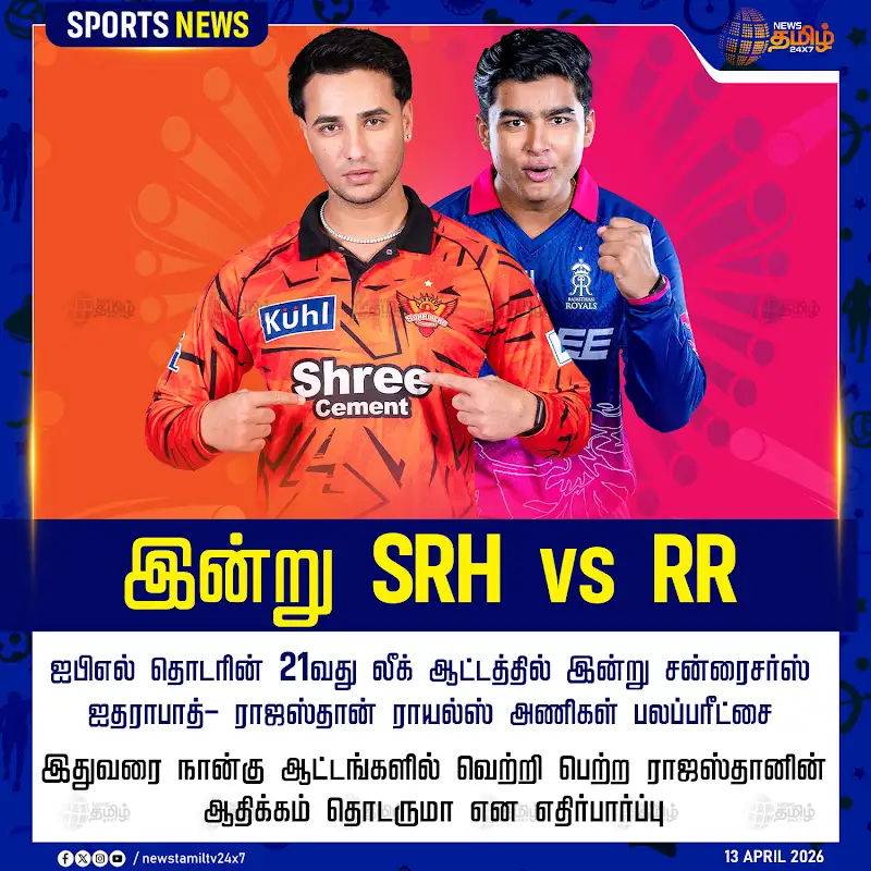 இன்று SRH vs RRஐபிஎல் தொடரின் 21ஆவது லீக் ஆட்டத்தில் இன்று சன்ரைசர்ஸ் ஐதராபாத்- ராஜஸ்தான் ராயல்ஸ் அணிகள் பலப்பரீட்சை நடத்துகின்றன. இதுவரை நான்கு ஆட்டங்களில் வெற்றி பெற்ற ராஜஸ்தானின் ஆதிக்கம் தொடருமா என எதிர்பார்ப்பு எழுந்துள்ளது.