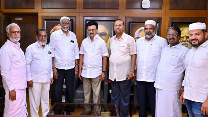 சென்னை அண்ணா அறிவாலயத்தில் தி.மு.க. தலைவரும், முதல்-அமைச்சருமான மு.க.ஸ்டாலினை தமிழக மஸ்ஜிதுகளின் ஐக்கிய ஜமாஅத் கூட்டமைப்பு தலைவர் முகமது பஷீர், பொதுச்செயலாளர் முகமதுபெய்க் மற்றும் நிர்வாகிகள் நேற்று சந்தித்து சட்டமன்ற தேர்தலில் தி.மு.க. கூட்டணிக்கு ஆதரவு தெரிவித்தனர்.