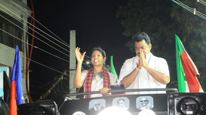 ஈரோடு மேற்கு தொகுதி தி.மு.க வேட்பாளரும், அமைச்சருமான முத்துசாமியை ஆதரித்து தி.மு.க பொதுச்செயலாளரும், எம்.பி-யுமான கனிமொழி வெள்ளோடு நால்ரோட்டு பகுதியில் நேற்றிரவு தேர்தல் பரப்புரையில் ஈடுபட்டார்.