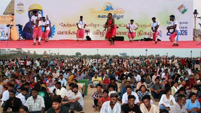 இன்று (12.04.2026) மாலை 5.30 மணி முதல் மூன்று மணி நேரம் மெரினாவில் உள்ள 2 நீலக்கொடி கடற்கரைப் பகுதிகளில் 100க்கும் மேற்பட்ட கலைஞர்கள் பங்கேற்று சிறப்பாக நடைபெற்ற இந்த கலை நிகழ்ச்சிகளின் மூலமாக பல்லாயிரக்கணக்கான பொதுமக்களுக்கு வாக்களிப்பதன் அவசியம் குறித்து விழிப்புணர்வு ஏற்படுத்தப்பட்டது.