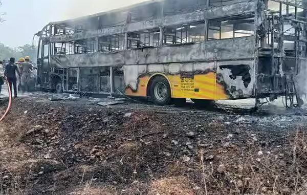 கர்நாடகாவின் யாத்கிர் மாவட்டம், சுரபுரா தாலுகாவின் தேவாபுரா கிராமம் அருகே, காலை கார் ஒன்று சென்று கொண்டிருந்தது. திடீரென அந்தக் காரின் டயர் வெடித்ததில், கட்டுப்பாட்டை இழந்து, எதிரே வந்த தனியார் பஸ் மீது மோதியது. மோதிய வேகத்தில் இரண்டு வாகனங்களிலும் தீப்பிடித்தது.