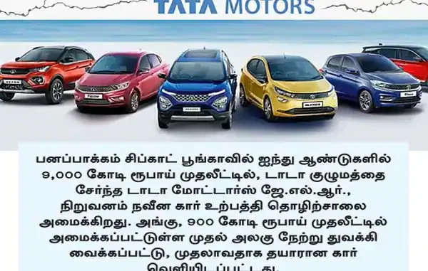 பனப்பாக்கம் சிப்காட் பூங்காவில் ஐந்து ஆண்டுகளில் 9,000 கோடி ரூபாய் முதலீட்டில், டாடா குழுமத்தை சேர்ந்த டாடா மோட்டார்ஸ் ஜே.எல்.ஆர்., நிறுவனம் நவீன கார் உற்பத்தி தொழிற்சாலை அமைக்கிறது. அங்கு, 900 கோடி ரூபாய் முதலீட்டில் அமைக்கப்பட்டுள்ள முதல் அலகு நேற்று துவக்கி வைக்கப்பட்டு, முதலாவதாக தயாரான கார் வெளியிடப்பட்டது.