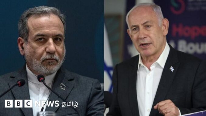 படக்குறிப்பு, லெபனானில் இஸ்ரேல் நடத்தும் தாக்குதல்கள் போர் நிறுத்த ஒப்பந்தத்தின் விதிமுறைகளை மீறுவதாக இரான் கூறியுள்ளது (படத்தில், இடதுபுறம் – இரானிய வெளியுறவு அமைச்சர் அப்பாஸ் அராக்சி மற்றும் வலதுபுறம் – இஸ்ரேலிய பிரதமர் பெஞ்சமின் நெதன்யாகு).
