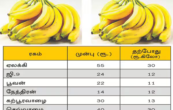 ஆனால், அங்கு விளைந்தவையே போதுமானதாக இருப்பதால், இங்கிருந்து கொள்முதல் செய்யப்படவில்லை. இதனால் வாழைப்பழ ரகங்களின் விலை கிட்டத்தட்ட 50 சதவீத அளவுக்கு வீழ்ச்சி கண்டுள்ளது.