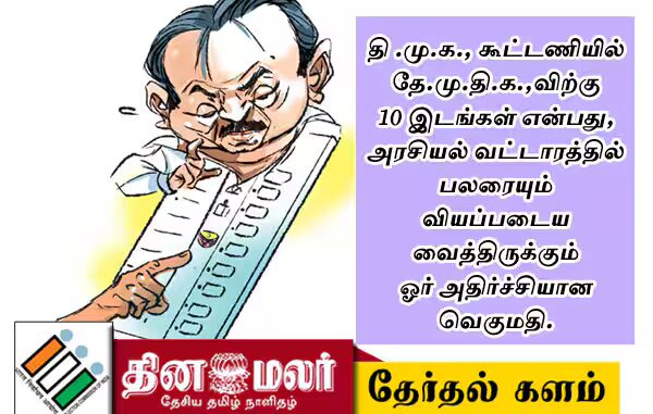 * தே.மு.தி.க., தங்களின் முரசு சின்னத்திலேயே போட்டியிட ஒப்பந்தம் ஆகியிருப்பதும்; உதயசூரியனில் போட்டியிட கட்டாயப்படுத்தப்படும் ம.தி.மு.க., மற்றும் தி.மு.க.,வுடன் நெடுங்காலமாக பயணிக்கும் சிறு கட்சிகள் மத்தியில் அதிருப்தியை கிளப்பியிருக்கிறது