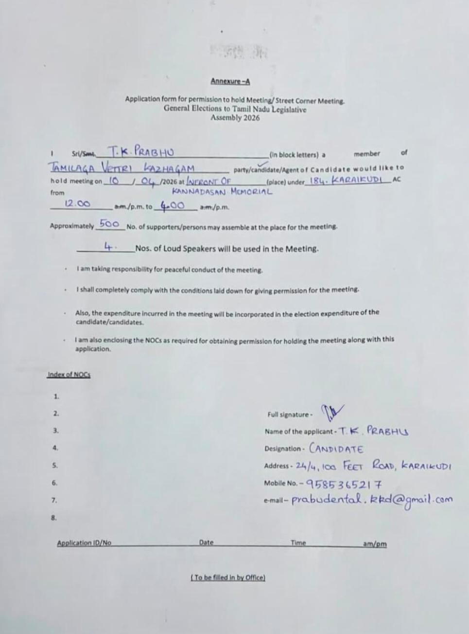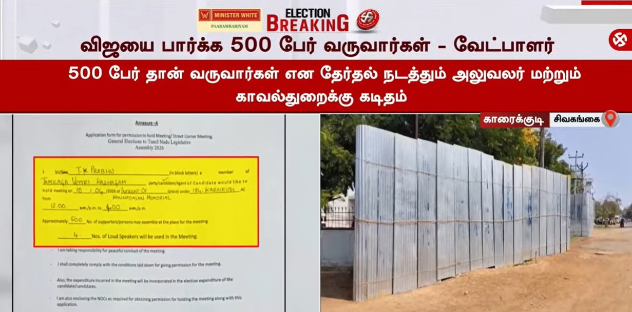 காரைக்குடியில் விஜய் சிவகங்கை மாவட்டம், காரைக்குடி சட்டப்பேரவை தொகுதிக்கு உட்பட்ட பகுதியில், நாளை ஏப்ரல் 10ஆம் தேதி தவெக தலைவர் விஜய், வாக்கு சேகரிக்க உள்ளார். இந்த நிலையில், தவெக கிழக்கு மாவட்ட செயலாளரும் காரைக்குடி சட்டமன்றத் தொகுதி வேட்பாளருமான டாக்டர் டி.கே.பிரபு தேர்தல் நடத்தும் அலுவலர் மற்றும் காவல் துறையினரிடம் அவர்களது கட்சித் தலைவர் விஜய் பரப்பரை மேற்கொள்வதற்காக அனுமதி கடிதம் வழங்கி உள்ளார். அதில் 500 நபர்கள் பங்கேற்க உள்ளனர் என்று கூறி உள்ளார்.