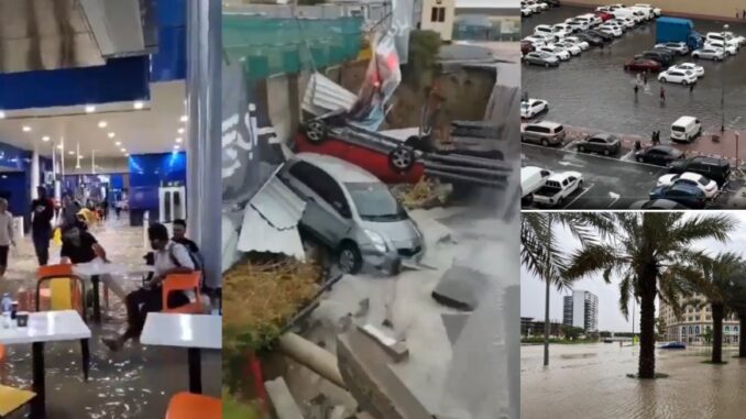 ஐக்கிய அரபு எமிரேட்சில் வானிலையில் ஏற்பட்ட மாற்றம் காரணமாக நேற்று (ஏப்ரல் 15) முதல் கொட்டித் தீர்க்கும் கனமழையால் பல்வேறு இடங்கள் வெள்ளத்தில் மிதக்கின்றன.