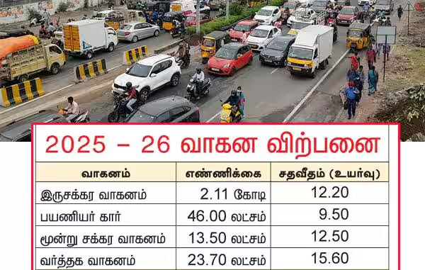 சென்னை: கடந்த 2025- 26ம் நிதிஆண்டில், மொத்த வாகன விற்பனை, 12 சதவீதம் அதிகரித்து, 2.94 கோடியானது. முந்தைய நிதி ஆண்டில், 2.61 கோடி வாகனங்கள் விற்பனை செய்யப்பட்டன.