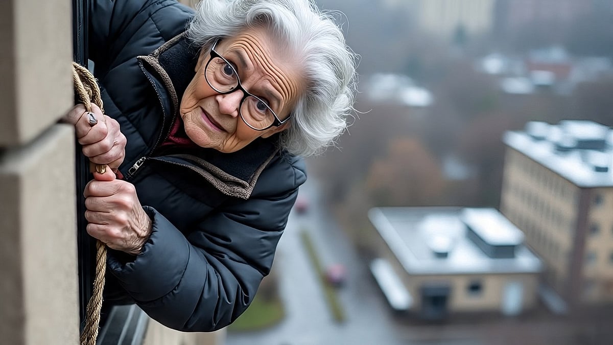 பொதுவாக இது போன்ற சூழலில் பதற்றமடைவது இயல்பு, ஆனால் இந்தப் பாட்டியோ சற்றும் யோசிக்காமல் தனது ஜன்னல் வழியாக வெளியேறி, கட்டடத்தின் வெளிப்புறச் சுவற்றின் வழியாகக் கீழே இறங்கத் துணிந்தார்.