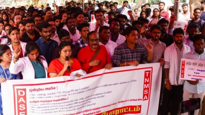 இந்த போராட்டத்திற்கு தலைமை தாங்கிய டாக்டர் ரவீந்திரநாத் நிருபர்களிடம் பேசியதாவது: மருத்துவக் கல்லூரிகளில் உள்ள மொத்த பயிற்சி மருத்துவர் இடங்களில் 20 விழுக்காடு அளவிற்கான இடங்களை வெளிநாட்டில் மருத்துவம் பயின்ற மருத்துவப் பட்டதாரிகளுக்கு வழங்கிட வேண்டும். மாவட்ட அரசு மருத்துவமனைகளிலும், வெளிநாட்டில் மருத்துவம் பயின்ற மருத்துவப் பட்டதாரிகளுக்கு பயிற்சி மருத்துவராக பயிற்சி பெற அனுமதி வழங்கிட தேசிய மருத்துவ ஆணையமே (NMC) 2022 ஆண்டிலேயே மாவட்ட அரசு மருத்துவமனைகளில் FMG பட்டதாரிகளை பயிற்சி மருத்துவராக பயிற்சி பெறலாம் என்ற அனுமதி வழங்கியுள்ளது.