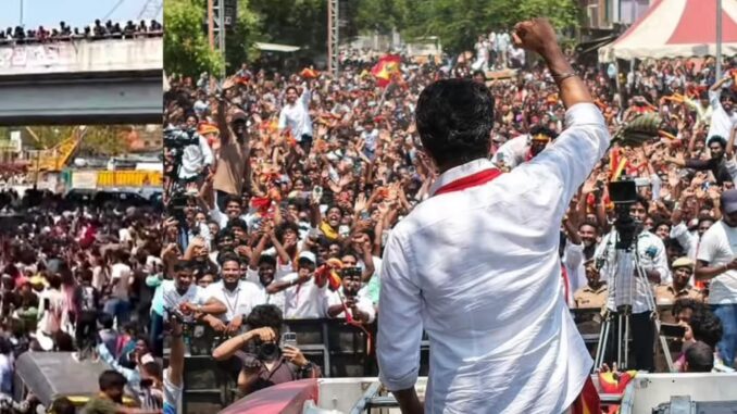 தமிழக வெற்றிக் கழகத் தலைவர் விஜய், 2026 சட்டமன்றத் தேர்தலுக்கான தனது அனல் பறக்கும் தேர்தல் பரப்புரையை இன்று (மார்ச் 30, 2026) முறைப்படி தொடங்கினார். இன்று மதியம் சென்னை பெரம்பூர் தொகுதியில் தனது முதல் வேட்புமனுவைத் தாக்கல் செய்த அவர், கையோடு அங்கேயே தனது தேர்தல் பிரச்சாரத்தையும் ஆரம்பித்தார். “இது ஒரு தலைமுறைக்கான தேர்தல்” என்று முழங்கிய விஜய், தமிழகத்தில் நிலவும் அரசியல் சூழலை மாற்ற ‘விசில் புரட்சி’ அவசியம் என்று உருக்கமாகப் பேசினார். பெரம்பூரில் அவர் திரட்டிய பிரம்மாண்ட கூட்டம், மற்ற அரசியல் கட்சிகளைத் திரும்பிப் பார்க்க வைத்துள்ளது.