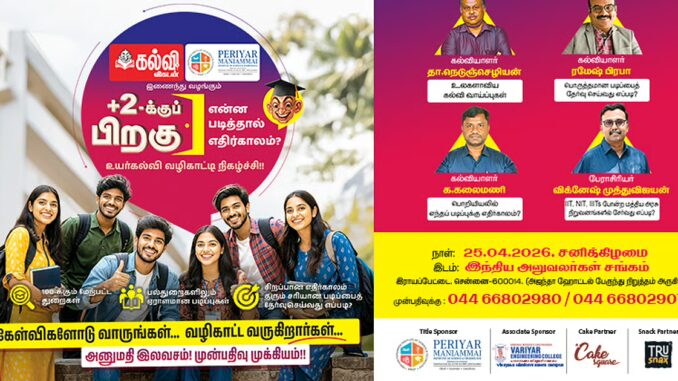 கல்வி விகடனும் பெரியார் மணியம்மை அறிவியல் மற்றும் தொழில்நுட்ப மையமும் இணைந்து வரும் 25.04.2026 சனிக்கிழமை, ‘+2-வுக்குப் பிறகு என்ன படித்தால் எதிர்காலம்’ என்ற வழிகாட்டுதல் நிகழ்ச்சியை நடத்தவுள்ளன.