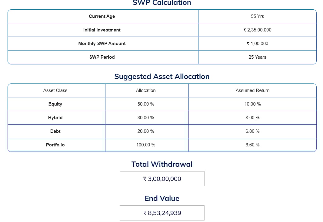 இப்ப சண்முகவேல் சேர்த்த பணத்துல இருந்து மாசாமாசம் 1 லட்சம் ரூபாயை அடுத்த 25 வருஷத்துக்கு SWP மூலமா திரும்ப எடுக்க முடியுமா என்று கணக்கு போடுகிறார். அப்படி கணக்கு போட்டுப் பார்த்ததில் 80 வயது வரை மாசாமாசம் 1 லட்சம் ரூபாய் என மொத்தம் 3 கோடி ரூபாயை எடுக்கவும் முடியும். அப்படி எடுத்தது போக, அவர் சேர்த்து வைத்திருக்கிற பணம் 8.53 கோடி ரூபாயாக இருக்கும் என்பதைப் பார்த்த சண்முகவேலுக்கு சந்தோஷம் தாங்கவில்லை. மகனும், மகளும் நல்ல வேலைக்குப் போய்விட்டார்கள் என்றாலும் அவருக்கான செலவுப் பணத்தை யாரிடமும் கேட்கவேண்டிய அவசியம் இல்லை. தனக்குப் பிடித்த விஷயத்தை எல்லாம் செய்வதற்கு நல்ல விஷயத்தை செய்துவிட்ட மகிழ்ச்சியில் துள்ளிக் குதித்தார் சண்முகவேல்.