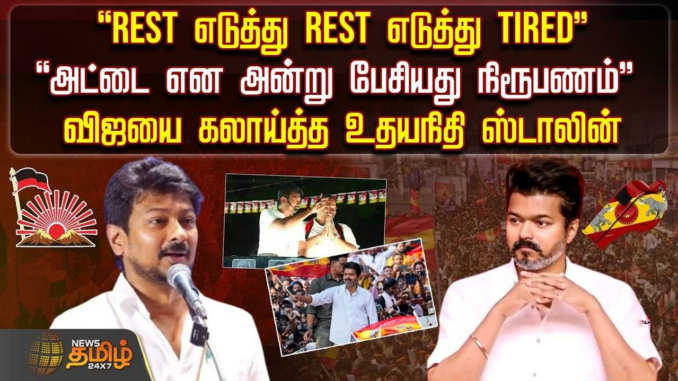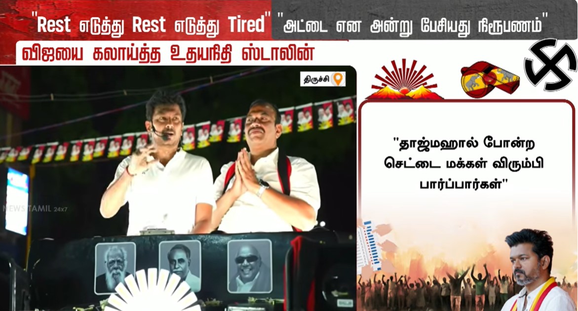 சென்னையில் சேப்பாக்கம் – திருவல்லிக்கேணி என 2 தொகுதியில் தாம் போட்டியிடுவதாக சில தற்குறிகள் பேசுவதாக துணை முதலமைச்சர் உதயநிதி ஸ்டாலின் விமர்சனம் செய்தார். திருச்சி கிழக்கு தொகுதி திமுக வேட்பாளரை ஆதரித்து பரப்புரை செய்தவர், சிலர் ரெஸ்ட் எடுத்து ரெஸ்ட் எடுத்தே டயர்ட் ஆகி விட்டதாகவும், அட்டை என தாம் பேசியது நிரூபணமாகி வருவதாகவும் விஜயை மறைமுகமாக தாக்கியும், கிண்டலடித்தும், பேசினார்.