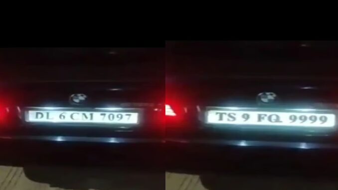 காரில் டெல்லி மற்றும் தெலங்கானா ஆகிய இரண்டு மாநிலங்களின் பதிவு எண்கள் கொண்ட பலகைகள் உள்ளன.